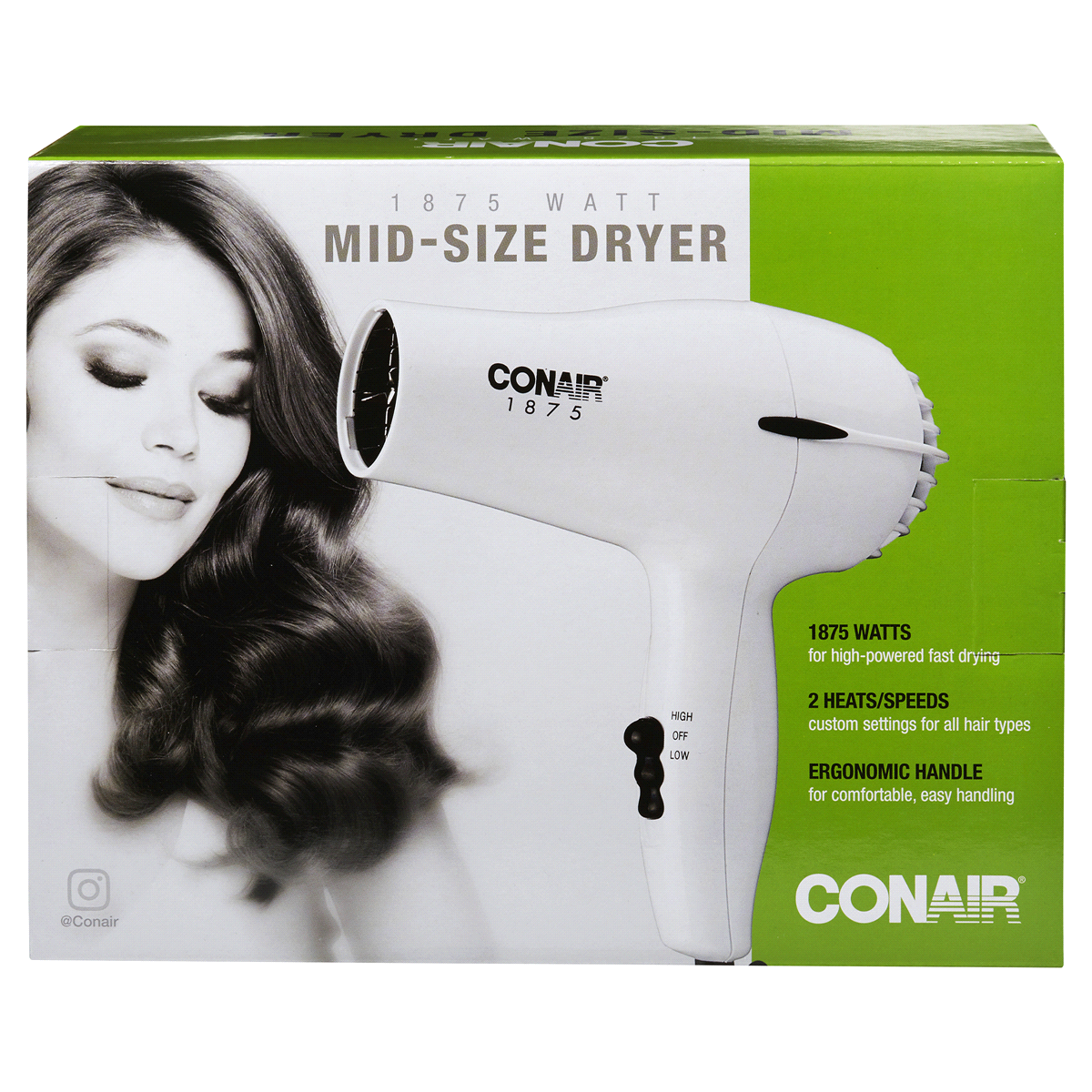 The CONAIR Mid-Size Hair Dryer offers the perfect balance of power and convenience. With a robust 1875 watts of drying power, this appliance ensures fast, efficient drying for all hair types. Its manageable mid-size is lighter and easier to handle than full-size models, making it ideal for everyday use at home or for travel.